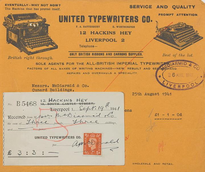 Rechnung mit Zahlungsbestätigung der United Typewriters Co., Liverpool adressiert an Messrs. McDiarmid & Co., Liverpool; datiert 25.08.1941 Maschinenschrift, Handschrift; Briefmarke Postage Revenue (U.K.) 2D