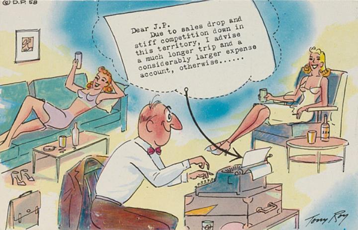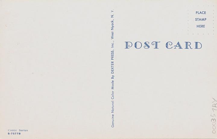 Illustrierte Postkarte; Grafik, polychrom; Comic Series S-7577B Rückseite: Mann mit Schreibmaschine, zwei Frauen mit Getränk Vorderseite nicht beschrieben