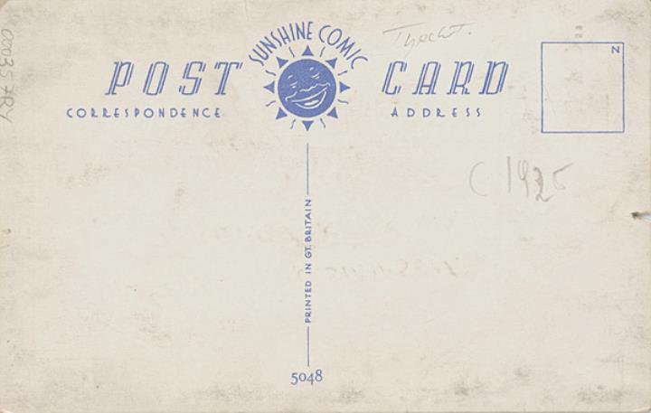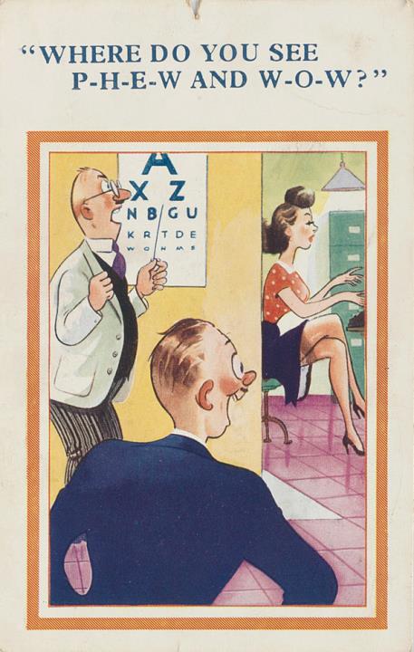 Illustrierte Postkarte; Grafik, polychrom; Nr. 5048 Rückseite: Büroszene; Arzt und Mann beim Sehtest, im Hintergrund Sekretärin mit Schreibmaschine Vorderseite nicht beschrieben