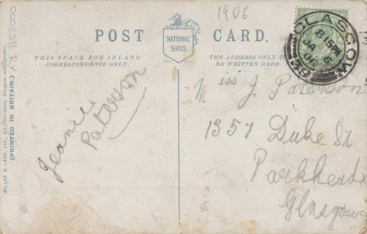 Illustrierte Postkarte; Grafik, polychrom Rückseite: Vorgesetzter und Sekretärin mit Schreibmaschine Vorderseite: beschrieben; adressiert an Miss Paterson, Glasgow; Briefmarke Postage Revenue (U.K.) Half Penny; Poststempel Glasgow/Ja 6 1906