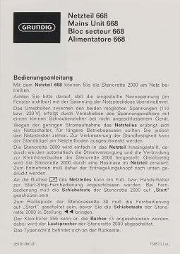Bedienungsanleitung für Netzteil 668 des Diktiergeräts Grundig Stenorette 2000 Nr. 05191-941.01