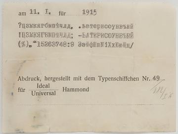 Schriftprobe der Schreibmaschine Hammond kyrillischer Schriftsatz; datiert 11.I.1915