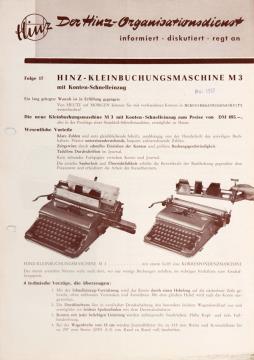 Prospekt für Schreib- und Buchungsmaschine Hinz M3 Nr. Ho17 03 57 mit Datumstempel versehen