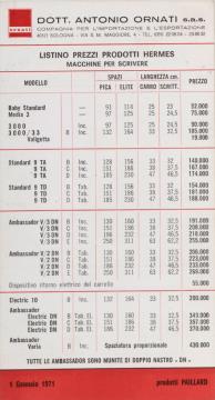 Fünf Preislisten der Schreibmaschinenhandlung Dott. Antonio Ornati s.a.s., Bologna für Schreibmaschinen Hermes Stand: 1.01.1971, 01.03.1972, 15.06.1973, 15.12.1973, 15.12.1973