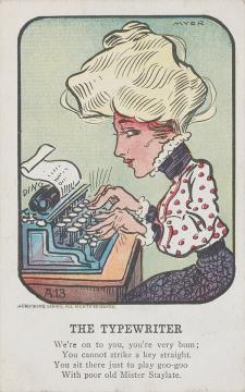 Illustrierte Postkarte; Grafik, polychrom; Aurocrome Series A.13 Rückseite: Sekretärin mit Schreibmaschine, darunter Text in Versform Vorderseite: adressiert an Miss Boyer, Des Moines; Briefmarke U.S. Postage One Cent; Poststempel Oil City/Jun 26 1907