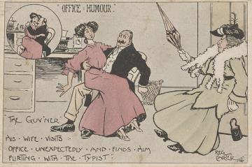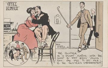 Illustrierte Postkarte; Grafik, polychrom Series Nr. 5118, Grafik: Reg Carter Rückseite: Büroszene in zwei Bildern; Sekretärin mit Vorgesetztem, Ehefrau betritt den Raum; Beschreibungstext Vorderseite beschrieben