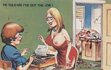Illustrierte Postkarte; Grafik, polychrom; Nr. CMC43 Rückseite: Büroszene; Sekretärin mit Schreibmaschine, halb bekleidete Frau verlässt das Chefbüro Vorderseite nicht beschrieben