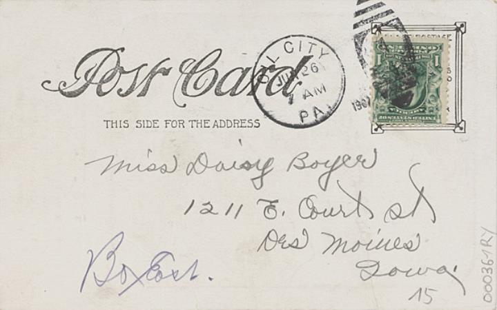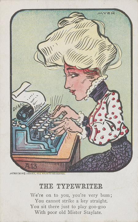 Illustrierte Postkarte; Grafik, polychrom; Aurocrome Series A.13 Rückseite: Sekretärin mit Schreibmaschine, darunter Text in Versform Vorderseite: adressiert an Miss Boyer, Des Moines; Briefmarke U.S. Postage One Cent; Poststempel Oil City/Jun 26 1907