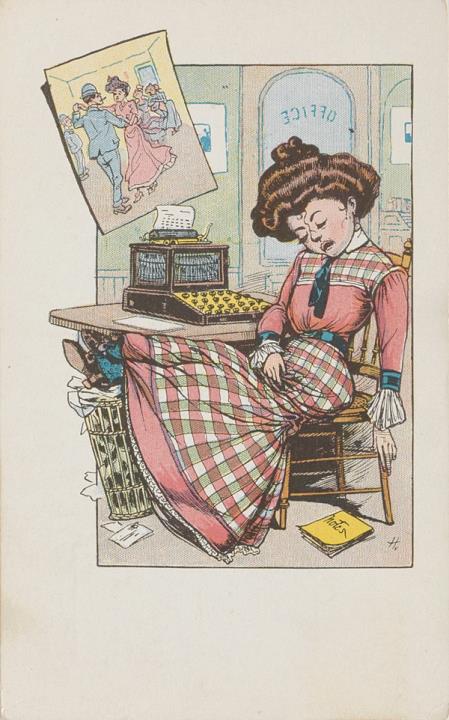 Illustrierte Postkarte; Grafik, polychrom Rückseite: Büroszene; schlafende Sekretärin mit Schreibmaschine Vorderseite nicht beschrieben