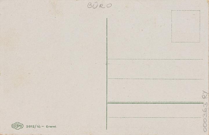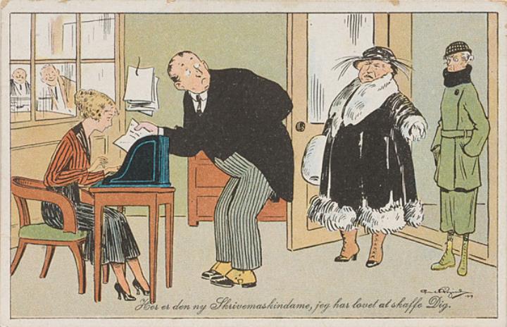Illustrierte Postkarte; Grafik, polychrom; Eneret Nr. 2612/10 Rückseite: Büroszene; Vorgesetzter und Sekretärin mit Schreibmaschine, Ehefrau betritt das Büro Vorderseite nicht beschrieben