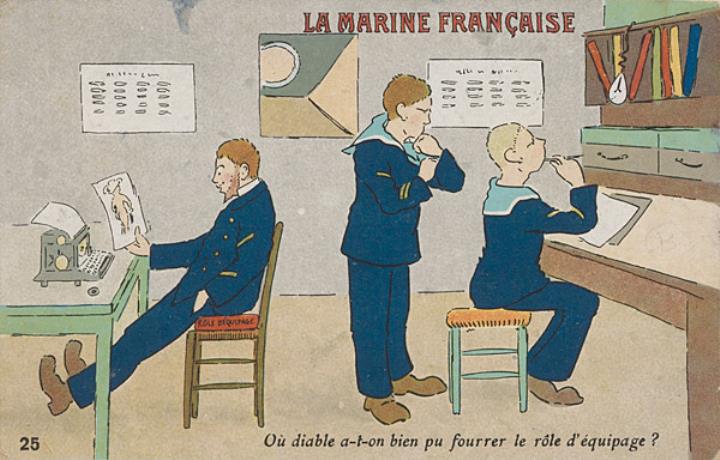 Illustrierte Postkarte; Grafik, polychrom; Nr. 25 Rückseite: Büroszene; drei Mitarbeiter in Uniform, Tisch mit Schreibmaschine Vorderseite beschrieben