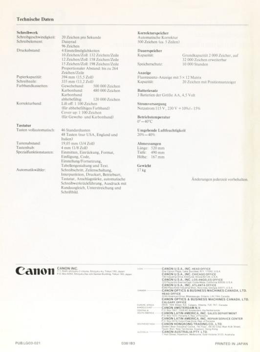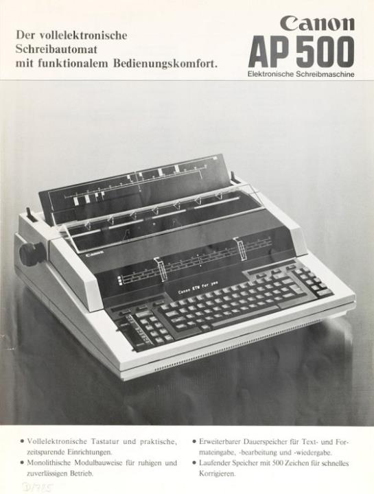 Prospekt für Schreibmaschine Canon AP 500 Der vollelektrische Schreibautomat mit funktionalem Bedienungskomfort Nr. PUB.LG03-021