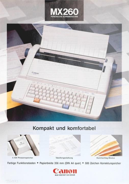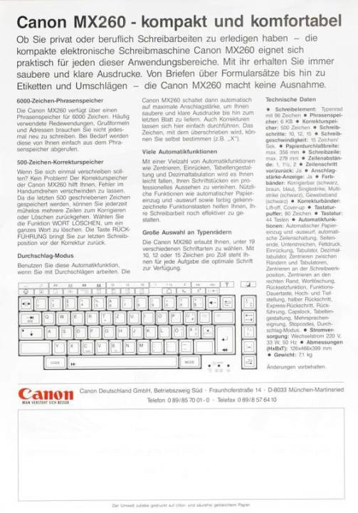 Prospekt für elektrische Schreibmaschine Canon MX260 Kompakt und komfortabel