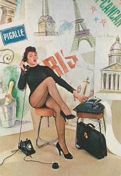 Illustrierte Postkarte; Fotografie, Grafik, polychrom Rückseite: Frau/Sekretärin mit Schreibmaschine und Telefon; im Hintergrund Ansichten von Paris Vorderseite nicht beschrieben