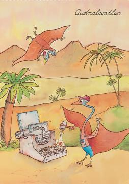 Illustrierte Postkarte; Grafik, polychrom Rückseite: zwei Flugsaurier mit Schreibmaschine aus Stein Vorderseite nicht beschrieben
