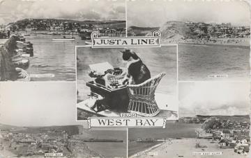 Illustrierte Postkarte; Fotocollage, monochrom Rückseite: Katze mit Schreibmaschine, vier Ansichten von West Bay Vorderseite nicht beschrieben
