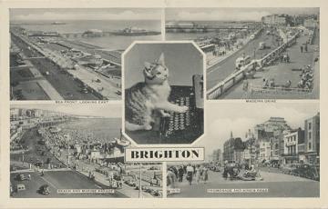 Illustrierte Postkarte; Fotocollage, monochrom Rückseite: Katze mit Schreibmaschine, vier Ansichten von Brighton Vorderseite: beschrieben; adressiert an Mrs. Laughran, Southampton; Briefmarke Postage Revenue (U.K.) 2 d; Poststempel Brighton/24 Jne 1957
