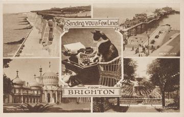 Illustrierte Postkarte; Fotocollage, monochrom Rückseite: Katze mit Schreibmaschine, vier Ansichten von Brigthon Vorderseite nicht beschrieben