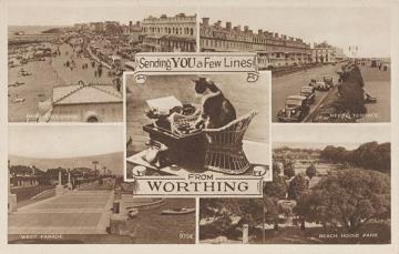 Illustrierte Postkarte; Fotocollage, monochrom Rückseite: Katze mit Schreibmaschine, vier Ansichten von Worthing Vorderseite: beschrieben; adressiert an Mrs. Jackson, Yorks; Briefmarke Postage Revenue (U.K.) 2 d; Poststempel Worthing/13 Jly 1955