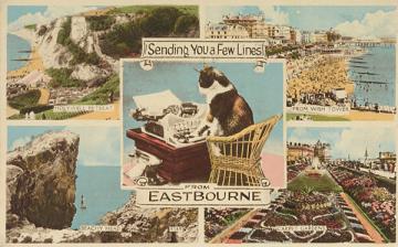 Illustrierte Postkarte; Fotocollage, koloriert Rückseite: Katze mit Schreibmaschine, vier Ansichten von Eastbourne Vorderseite: beschrieben; adressiert an Mr.+Mrs. Jarley, Devon; Briefmarke Postage Revenue (U.K.) 2 1/2 D; Poststempel Eastbourne/23 Aug 1959