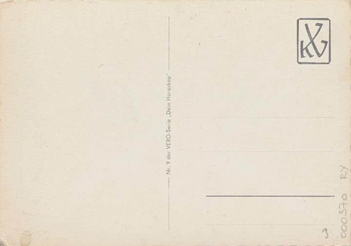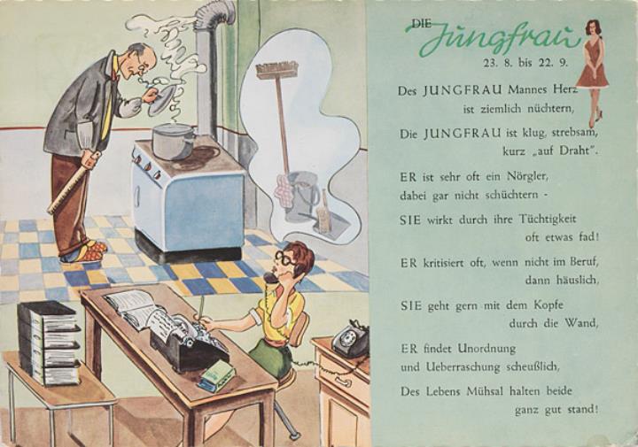 Illustrierte Postkarte; Grafik, polychrom; Vero Serie Nr. 9 Rückseite: Mann am Herd stehend, Frau im Büro mit Schreibmaschine; daneben Text zum Sternzeichen Vorderseite nicht beschrieben