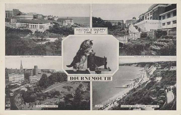 Illustrierte Postkarte; Fotocollage, monochrom Rückseite: Katze mit Fotoapparat, vier Ansichten von Bournemouth Vorderseite nicht beschrieben
