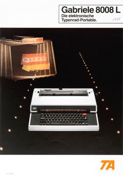Faltprospekt für Schreibmaschine Triumph-Adler Gabriele 8008 Die elektronische Typenrad-Portable Nr. 01122001/1085/50/40 Datum handschriftlich vermerkt