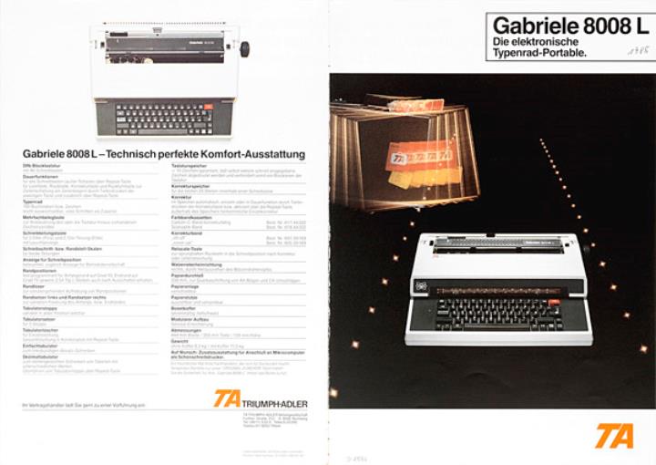 Faltprospekt für Schreibmaschine Triumph-Adler Gabriele 8008 Die elektronische Typenrad-Portable Nr. 01122001/1085/50/40 Datum handschriftlich vermerkt