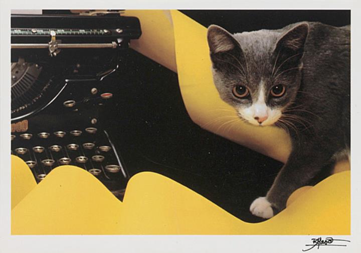 Illustrierte Postkarte; Grafik, polychrom; Serie Cartes d'Art, Fotograf: Bruno Maso Rückseite: Katze mit Schreibmaschine Vorderseite nicht beschrieben, zwei Exemplare