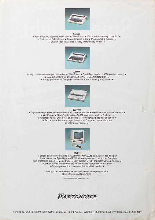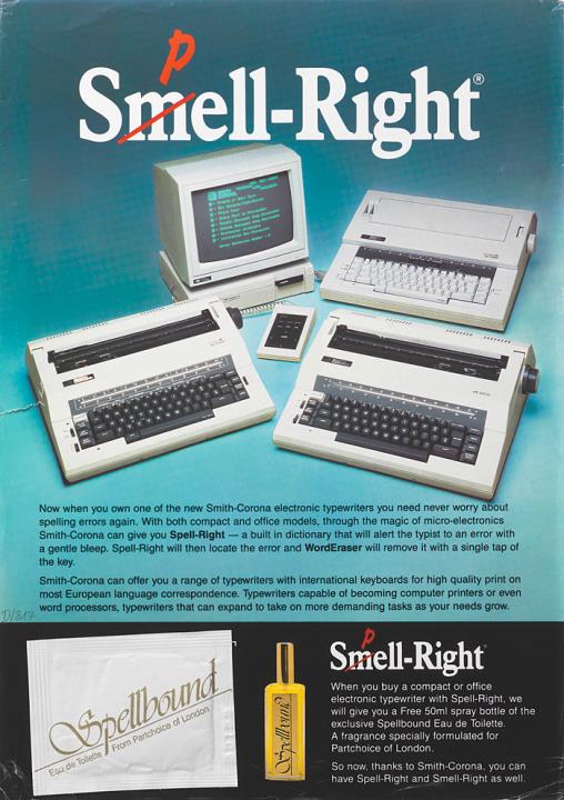 Prospekt für Schreibmaschine Smith-Corona mit integriertem Wörterbuch inklusive Werbegeschenk Parfum Spellbound