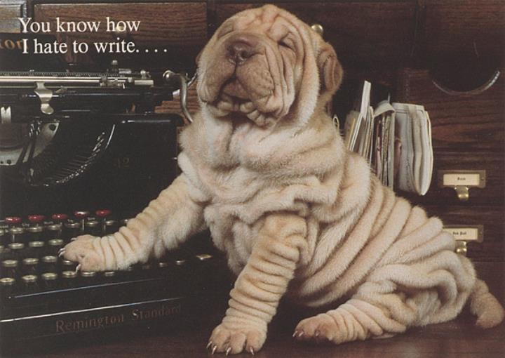 Illustrierte Postkarte; Fotografie, polychrom Rückseite: Hund mit Schreibmaschine Vorderseite nicht beschrieben