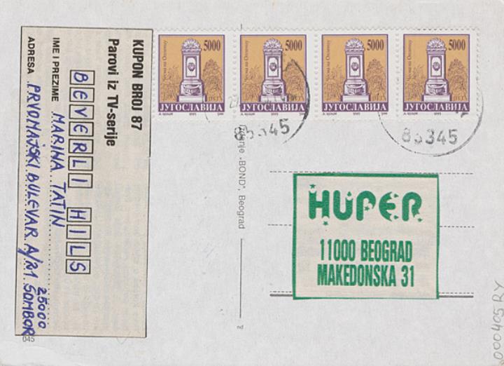 Illustrierte Postkarte; Fotografie, polychrom Rückseite: bekleideter Affe/Schimpanse mit Schreibmaschine und Puderdose Vorderseite: aufgeklebter Rätselkupon und Adresse; vier Briefmarken Jugoslavia 5000; Poststempel unleserlich