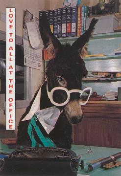 Illustrierte Postkarte; Fotografie, polychrom; Serie Leo A10 Rückseite: Esel mit Brille aus Papier und Schreibmaschine Vorderseite nicht beschrieben