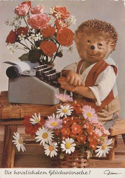 Illustrierte Postkarte; Fotografie, polychrom; Nr. 418 Rückseite: Igel Mecki mit Schreibmaschine und Blumen Vorderseite: beschrieben, datiert 11/08 1975; adressiert; Poststempel unleserlich