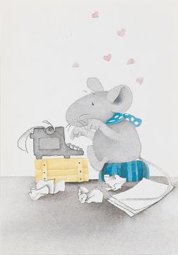 Illustrierte Postkarte; Grafik, polychrom; Philipp Postkarte Rückseite: Maus mit Schreibmaschine, darüber fliegende Herzen Vorderseite nicht beschrieben