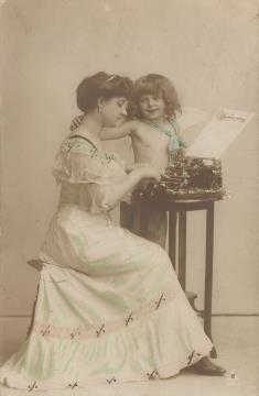 Illustrierte Postkarte; Fotografie, koloriert; Serie PH 865-5 Rückseite: Kind als Engel neben Frau mit dekorierter Schreibmaschine, Briefblatt mit Aufschrift "Donnerstag" Vorderseite: beschrieben; adressiert an Mademoiselle Pierard, Anseremme; Briefmarke Postes Belgique 5c; Poststempel Anseremme/31 Aout 1906