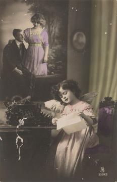 Illustrierte Postkarte; Fotografie, koloriert; Serie S 3339/5 Rückseite: Kind als Engel mit Schreibmaschine Ideal, im Hintergrund Mann und Frau als Paar Vorderseite beschrieben und adressiert, datiert 1913