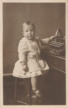 Illustrierte Postkarte; Fotografie, monochrom Rückseite: Kind mit Schreibmaschine Oliver Vorderseite beschrieben