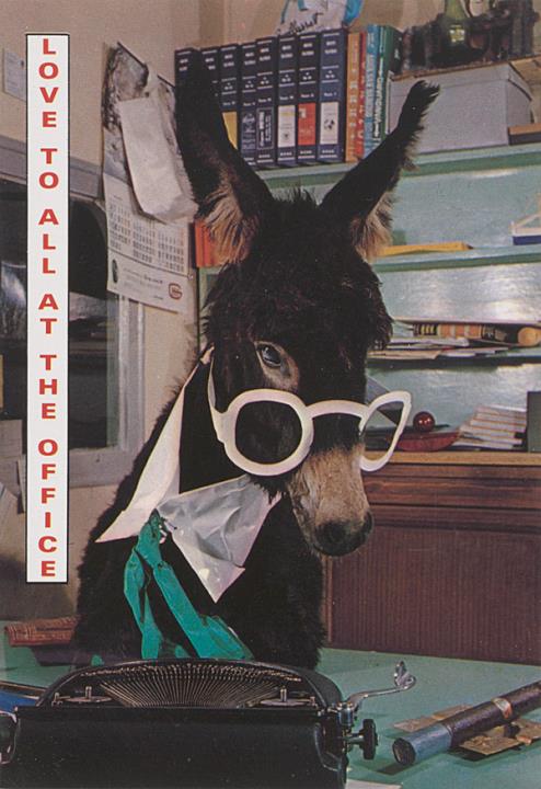 Illustrierte Postkarte; Fotografie, polychrom; Serie Leo A10 Rückseite: Esel mit Brille aus Papier und Schreibmaschine Vorderseite nicht beschrieben, zwei Exemplare