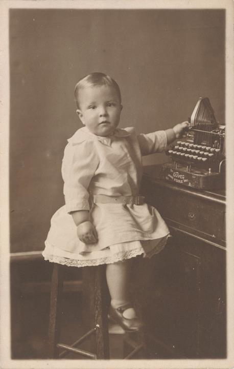 Illustrierte Postkarte; Fotografie, monochrom Rückseite: Kind mit Schreibmaschine Oliver Vorderseite beschrieben