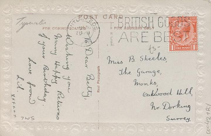Illustrierte Postkarte; Fotografie, koloriert; Nr. 2233/1 Rückseite: Mädchen mit Schreibmaschine, Text in Versform, dekorativer Rahmen mit Blumen in Blindprägung Vorderseite: beschrieben; adressiert an Miss Skeeles, Dorking; Briefmarke Postage Revenue (U.K.) One Penny; Poststempel Jul 30 1926
