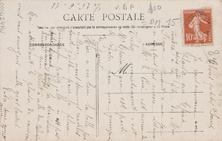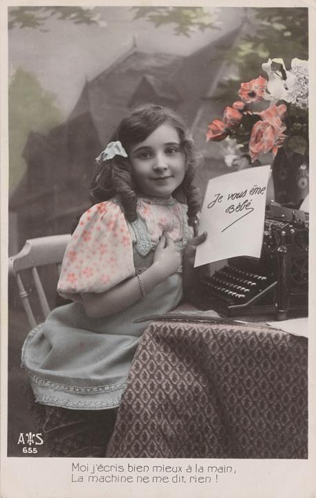 Illustrierte Postkarte; Fotografie, koloriert; Serie A S 655 Rückseite: Mädchen mit Schreibmaschine, Blick zum Betrachter, Blumen als Dekoration, Text in Versform Vorderseite: beschrieben, datiert 26.06.1911; Briefmarke Postes Francaises 10c; Poststempel unleserlich