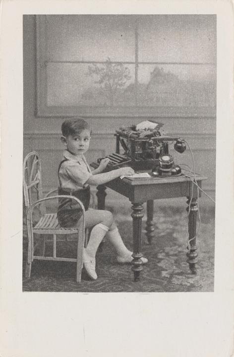Illustrierte Postkarte; Fotografie, monochrom Rückseite: Junge mit Schreibmaschine Vorderseite nicht beschrieben