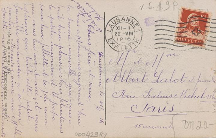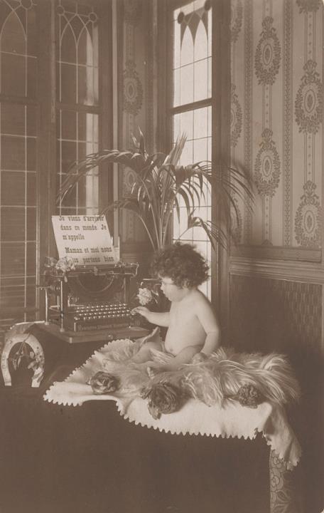 Illustrierte Postkarte; Fotografie, monochrom Rückseite: Baby mit Schreibmaschine, Briefblatt mit Text Vorderseite: beschrieben, adressiert; Briefmarke Helvetia 10 Rp; Poststempel Lausanne/22 VIII 1916