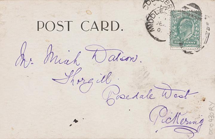 Illustrierte Postkarte; Fotografie, monochrom Rückseite: Baby mit Schreibmaschine, Leerraum beschrieben Vorderseite: adressiert; Briefmarke Postage Revenue (U.K.) Half Penny; Poststempel Middlesbrough/xx Dez 190x