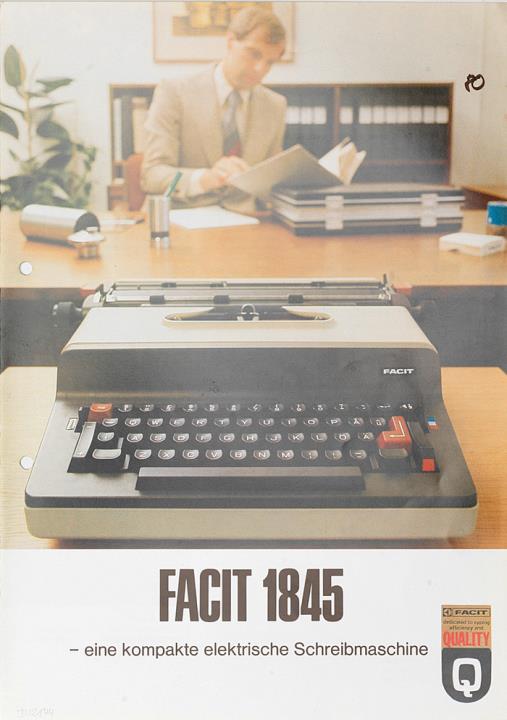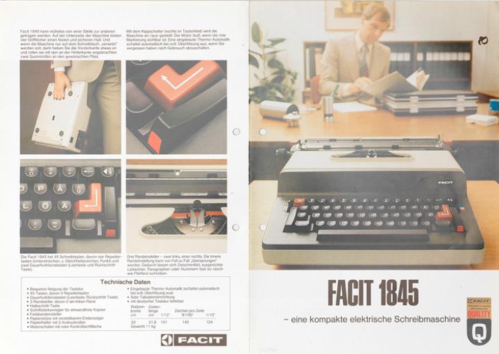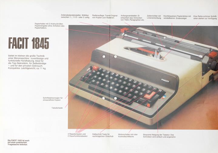 Faltprospekt für Schreibmaschine Facit 1845 eine kompakte elektrische Schreibmaschine Datum handschriftlich vermerkt