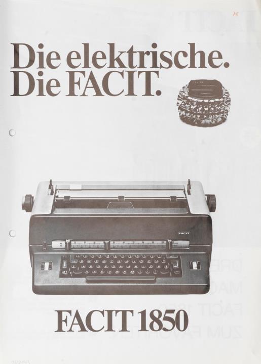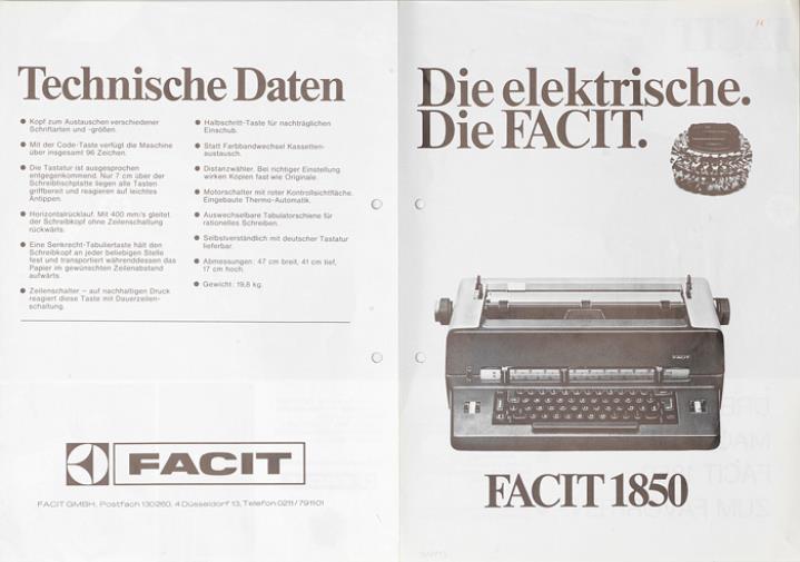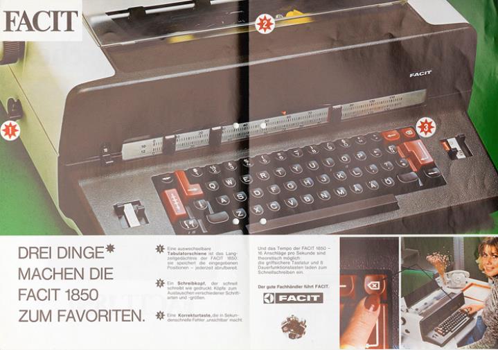 Faltprospekt für elektrische Schreibmaschine Facit 1850 Datum handschriftlich vermerkt