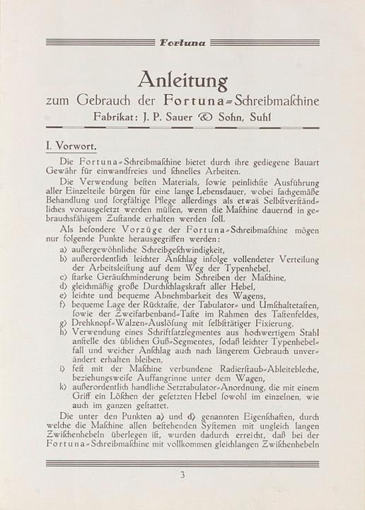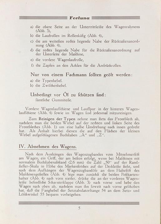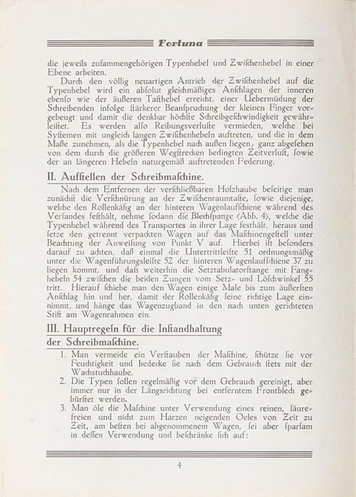 Bedienungsanleitung für Schreibmaschine Fortuna mit dem kurzen Typenhebel