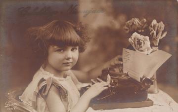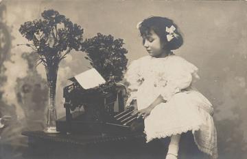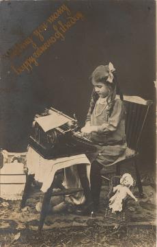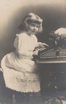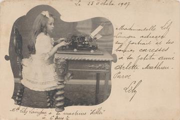 Illustrierte Postkarte; Fotografie, monochrom Rückseite: Mädchen mit Schreibmaschine; Leerraum beschrieben: M.lle Lily Lavigne á sa machine "Adler" á 6 ans 1/2 [...], datiert 25.10.1907 Vorderseite nicht beschrieben