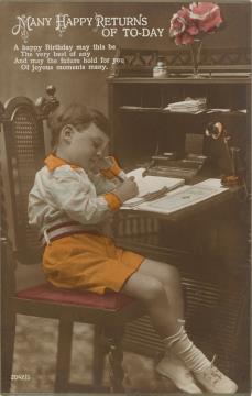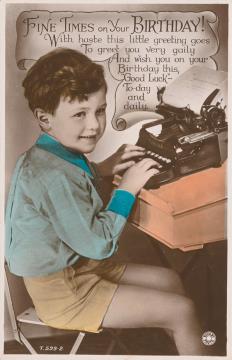 Illustrierte Postkarte; Fotografie, koloriert; Rotary Photo Nr. T599-6 Rückseite: Junge mit Schreibmaschine, Kartusche mit Text Vorderseite beschrieben